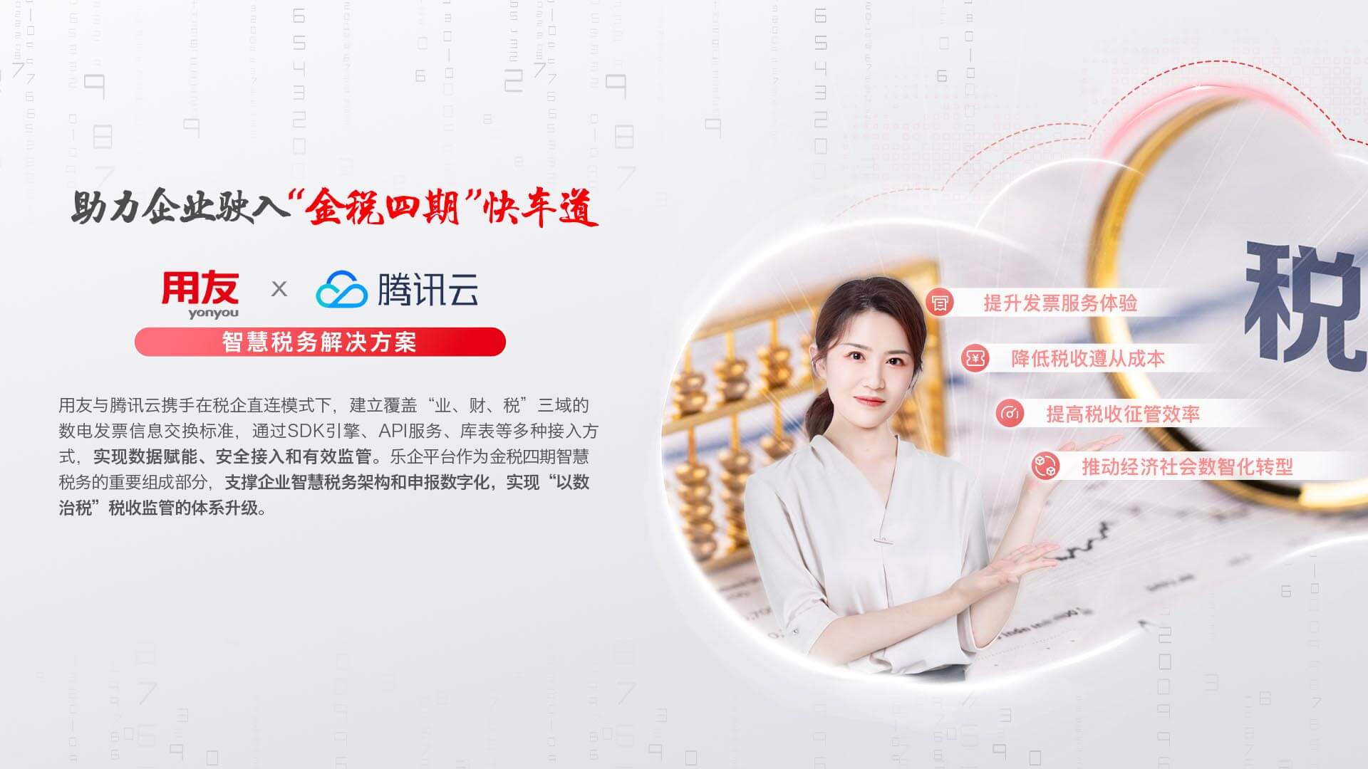 携手生态伙伴,联合打造产业平台,打通产业链上下游,形成“业财一体化”服务能力,发挥龙头企业示范效应,促进产业数字化、数字产业化。
